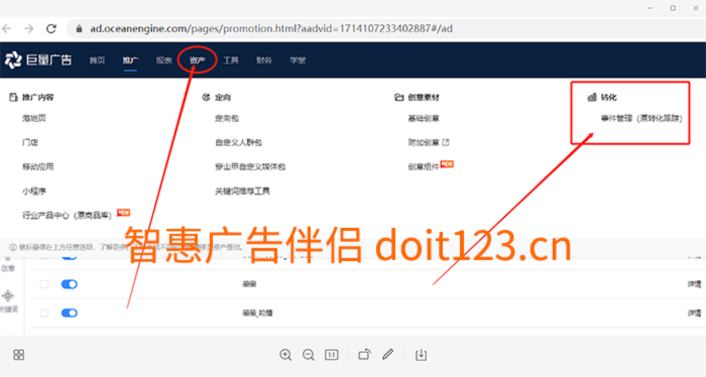 3)进入账户后,然后点击导航栏的资产,转化=》事件管理,点击